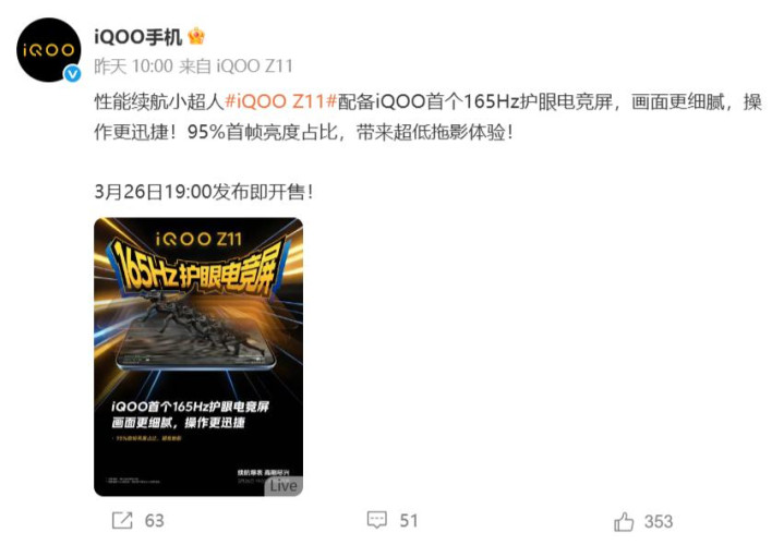 这是iqoo首款配备165Hz高刷的手机,画面更丝滑,屏幕尺寸在6.8英寸左右,是OLED材料,支持1.5k分辨率、高频PWM调光+类DC调光。